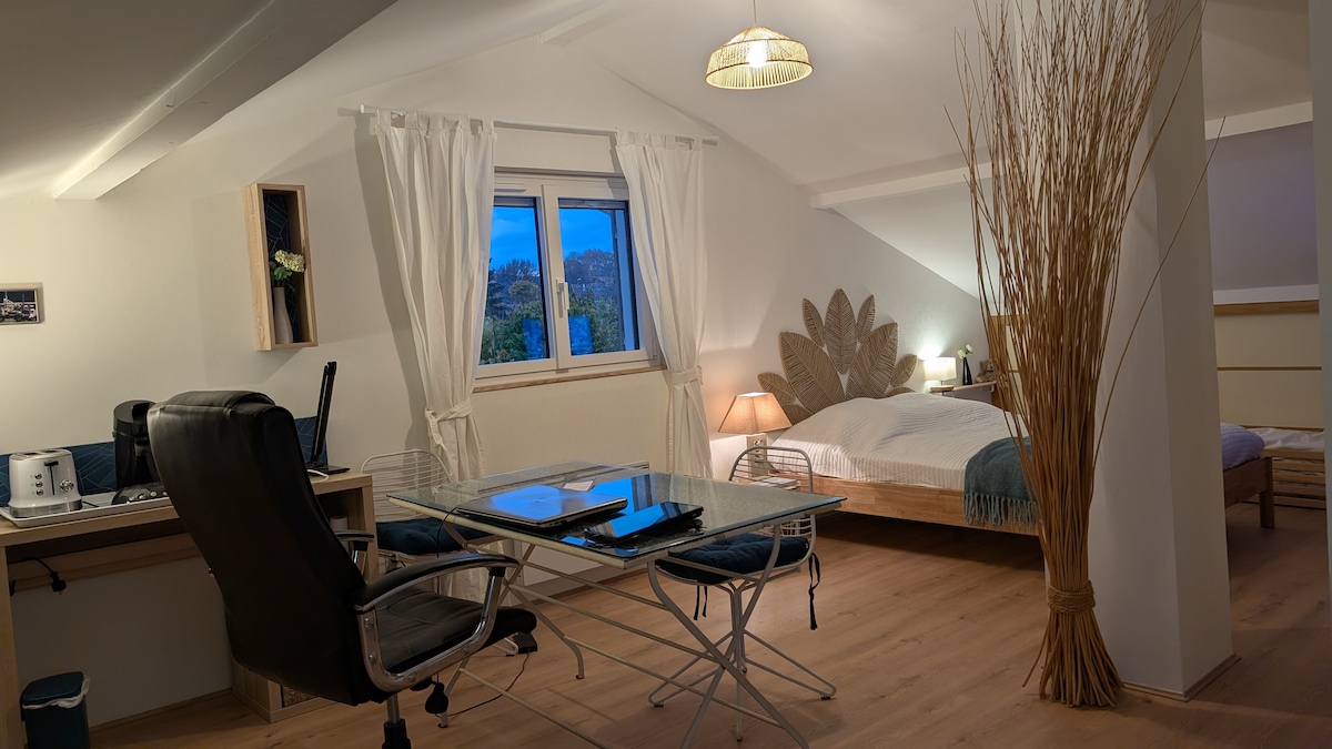 Cumplimiento del protocolo sanitario de Airbnb: estándares de limpieza e higiene con todos los equipos básicos disponibles aire acondicionado instalado El estudio está equipado con nevera con congelador, placa de inducción, microondas, cafetera y hervidor de agua, una pequeña tabla de planchar con plancha de viaje Cama para 2 personas y sofá cama para 2 personas colchón cama diario aparcamiento gratuito en nuestra propiedad