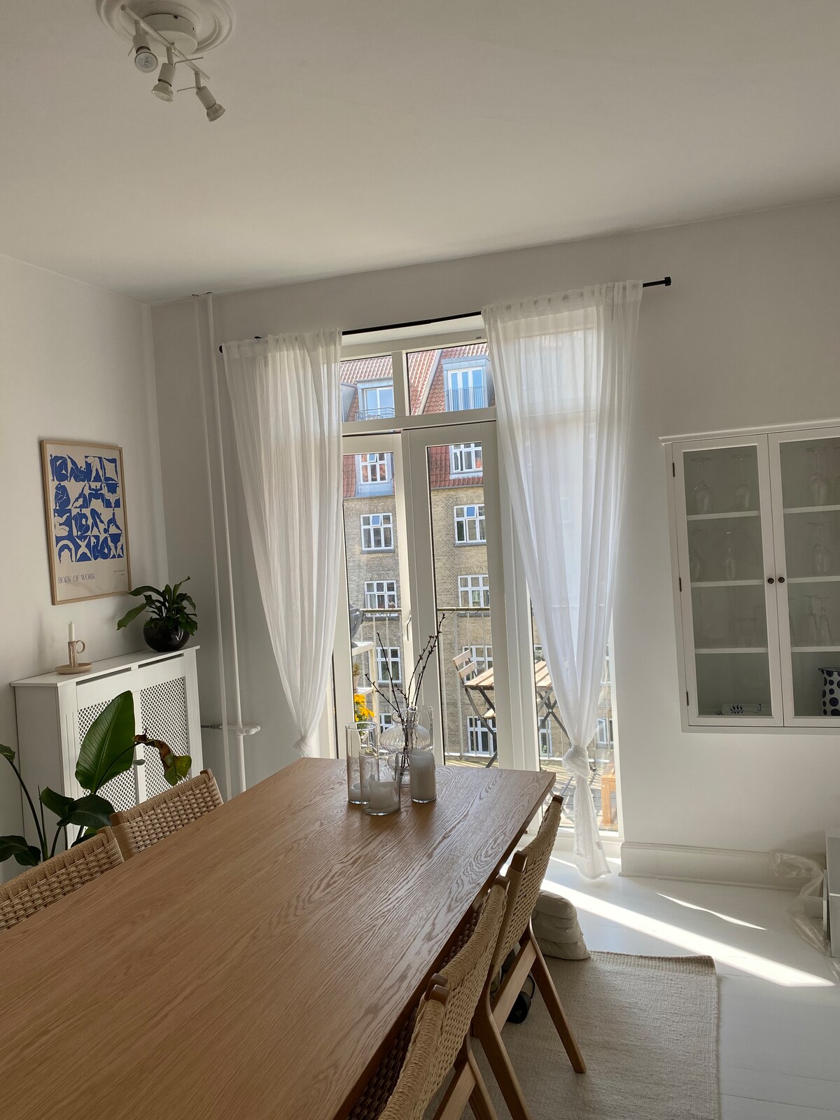 Lys og rummelig lejlighed med perfekt beliggenhed. Lejligheden består af stue og to soveværelser, køkken samt et lille badeværelse. Der er desuden adgang til fælles gårdhave. Området er virkeligt hyggeligt og trygt og byder på alle nødvendige indkøbsmuligheder, cafeer, vinbarer og restauranter. Jægergårdsgade, som findes bare få meter fra lejligheden, er en virkelig hyggelig gade! Busser og tog er meget tæt på lejligheden. Den er velegnet til par og venner – ingen festgrupper.