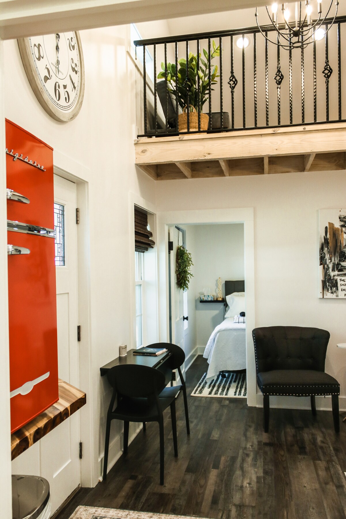 ¡Disfruta de la experiencia de la granja o de una escapada tranquila en nuestra acogedora casa de campo! Diseñada para ofrecer la máxima comodidad en solo 192 pies cuadrados, es el lugar perfecto para escapar. Aunque está diseñada para dos personas, podemos proporcionar un colchón doble adicional. La cocina pequeña incluye una nevera/congelador compacta, microondas y cafetera. La cama tamaño queen junto a la chimenea es el lugar perfecto para ver una película o leer un libro, o disfrutar de un café y puestas de sol desde las mecedoras en el porche envolvente. ¡Esperamos verte pronto!