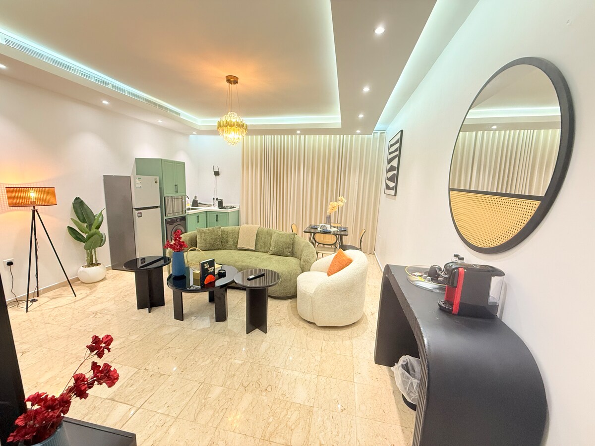 Welcome to our cozy private studio, designed for your comfort. 🚪Enjoy the convenience of Self Check-in with a smart keypad. Enjoy 5G wifi and a 75-inch TV with Netflix, Shahid, and YouTube Premium The bathroom is stocked with essentials like towels, soap, shampoo, and body wash for your convenience. Just a minute away, you'll find everything you need such as a mini-market, laundry service, barber shop, and restaurant