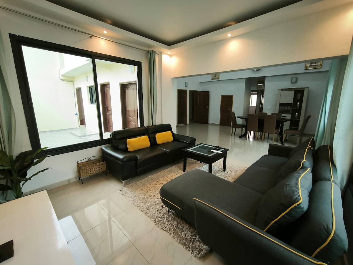 Casa situada en Angré, una zona residencial que forma parte de Cocody, cerca de las zonas de II Plateaux y Riviera. Cerrado al mercado tradicional de Cocovico y a muchos supermercados. No muy lejos del zoológico de Abidjan. Taxis disponibles cuando quieras. Red INALÁMBRICA disponible. El cuidador que vive en un apartamento contiguo estará encantado de facilitar tu estancia (llaves de la casa, consejos, algunas compras, etc.). Aproximadamente 130 metros cuadrados + jardines al aire libre. Perfecto para una familia o viajeros de vacaciones en Abidjan. 7 personas como máximo.