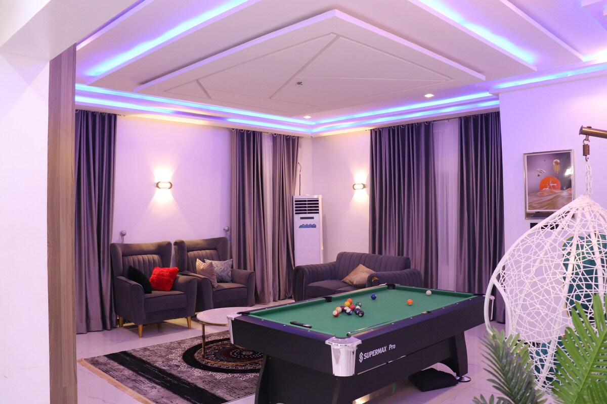 Airport Pick up/Drop off, daily driver services @ a fee. Royalty Luxury Serviced Apartment was concieved & designed as a home for Royals. It’s quiet, unique, stylish & homely with exquisite furnishing to give a feel of a comfy home. Located in a serene secured gated estate with convenient access to all part of Abj. 247 electricity with solar/Inverter systems, Fiber Optic wifi, fan, fully fitted modern kitchen, armed security. Pool table, relaxation swing, swimming pool & washing machine