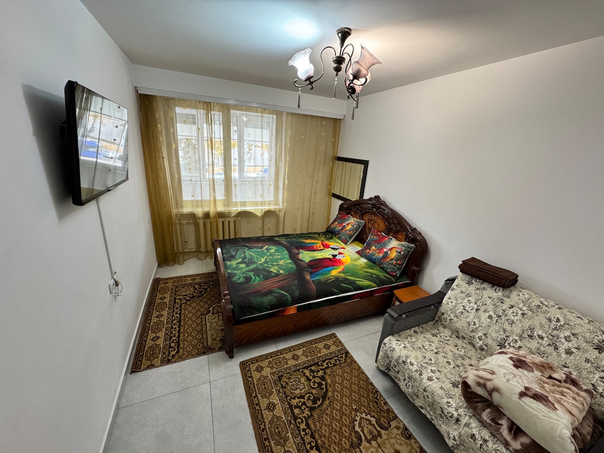 cozy spacy apartment (45 square meters- Room is 30 square meters) with big comfort bed - hot water 24/24 , full kitchen, bathroom. located in center -safest area of the city . I speak English fluently and can help u with learning Russian excursions, buying property, ,taking u from moldova to Tiraspol . Do not believe to mass media -my region is more safe than many areas in europe or usa. For foreign people is no problem to come here . Please ask any questions i can help with everything.