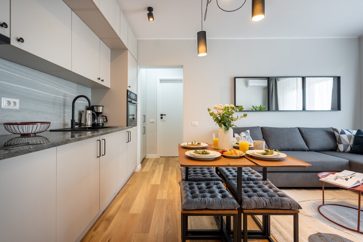 Designed to meet your needs. Open space kitchen with: a mini induction hob, microwave, sandwich maker, toaster, coffee maker (coffee capsules are free) and a chilling fridge. Living room: extendable sofa that turns into a double bed, a chic dining corner + an iPad w/ useful apps, a drinking water dispenser (free), a dedicated workspace with electrical outlets and USB ports & a private WIFI router. Bedroom: king size bed, TV, dressing, wireless chargers. Bathroom: walk-in shower, bidet, washer.
