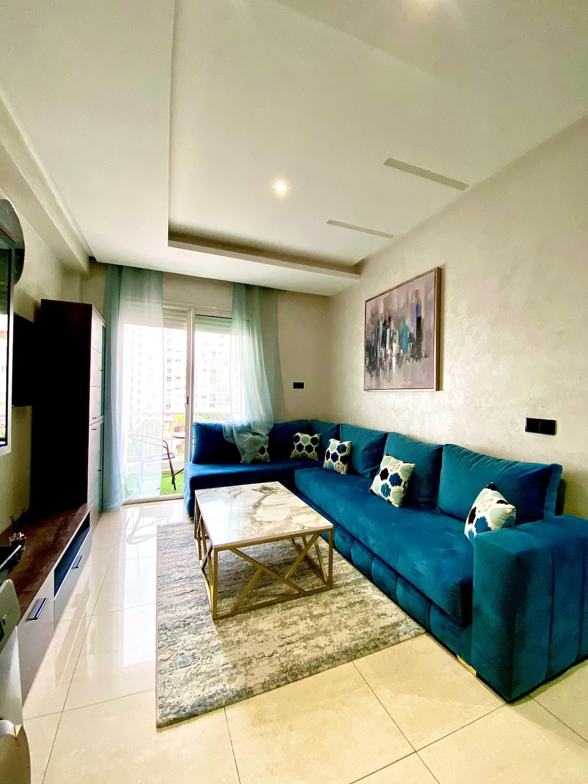 apartamento de alto categoría en el lugar más popular de Agadir que encontrará cerca, cafés restaurantes, playa, spa y hamam. el apartamento es ideal para 4 personas pero puede alojar hasta 6 personas El apartamento está equipado con un televisor led curvo, canales vía satélite (TF1, M6, canal Beinsport), wifi, 1 piscina grande en el edificio, aparcamiento gratuito y porteros las 24 horas