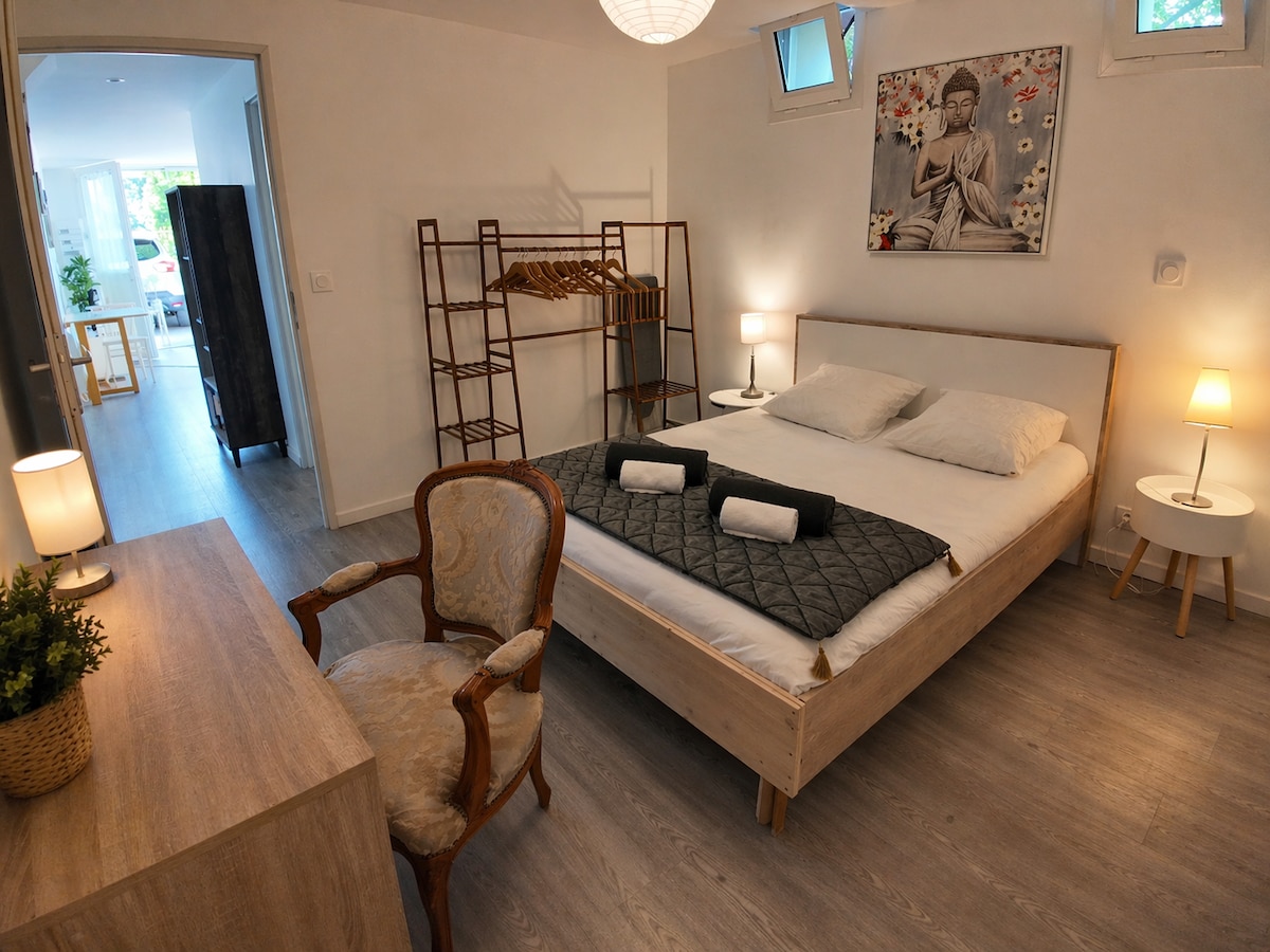 Casa nueva de una sola planta de 90 m2 con cocina equipada, calefacción por suelo radiante, baño con lavabo doble y ducha a ras de suelo + bañera Habitación equipada con vestidor Jardín + terraza de 15 m2 y muebles de jardín Aparcamiento privado de 2 plazas Sofá panorámico en una zona tranquila a 10 minutos de la autopista y a 5 minutos del centro de la ciudad de Agen. McDonald's, Intermarché, panadería, Ange y estanco a 5 minutos a pie (500 metros) Limpieza/ desinfección de toda la casa después de cada huésped