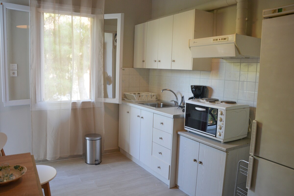 Mi apartamento está situado en el centro junto a una laguna y el puerto de Skala en la isla de Agistri. Es adecuado para una familia o un grupo de amigos que viajan de vacaciones. El departamento está en la planta baja con un patio con vistas a la laguna.