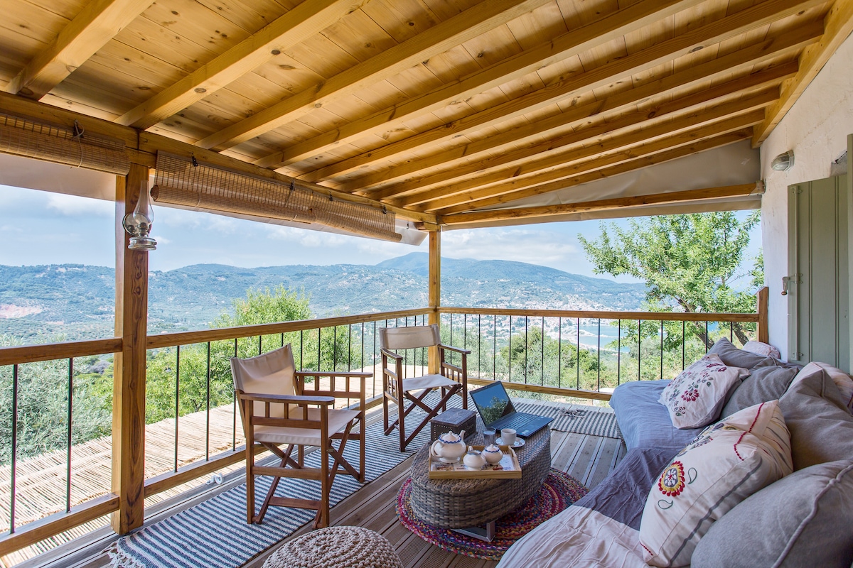 Tucked away in a private 4,000 m² olive grove with views of Skopelos town and the Aegean Sea, Apomero Cottage offers peaceful seclusion just a 15-minute walk from town. Once used during olive harvest season, the cottage blends traditional Greek island architecture with modern comfort. It consists of two buildings: one with a bedroom and bathroom, and another with a living room, second bathroom, and a sheltered, fully equipped kitchen and dining area. An organic vegetable garden is also a plus.