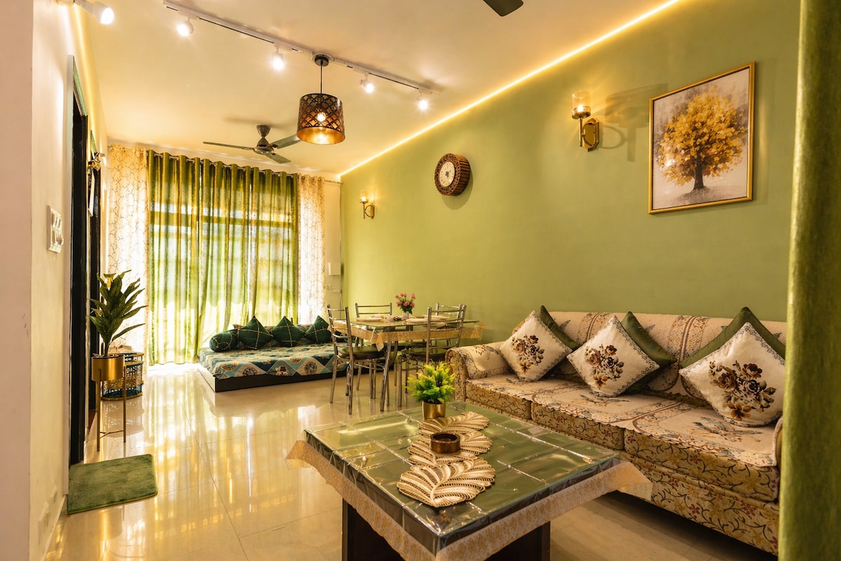 Stay in our stylish 1 BHK modern homestay featuring a subtle forest-inspired theme with warm wooden accents and cozy ambient lighting. Designed for comfort and relaxation, the space offers a peaceful escape from daily stress. Unwind in the bedroom with a Smart TV and complimentary OTT access perfect for movie nights and binge-watching your favorite shows. Ideal for couples or solo travelers looking for a serene stay with modern comforts and premium entertainment included.