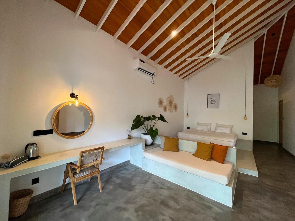Stay at Hello Mirissa, where contemporary design meets tropical calm. This A/C-equipped luxury boutique room includes a king-size bed, an attached bathroom with a walk-in shower, and a private outdoor dining area perfect for quiet meals. Perfect for couples or business travellers looking for serenity near popular attractions such as Mirissa Beach and Weligama’s Kai Beach Club. The room is furnished with essential amenities for a comfortable retreat.