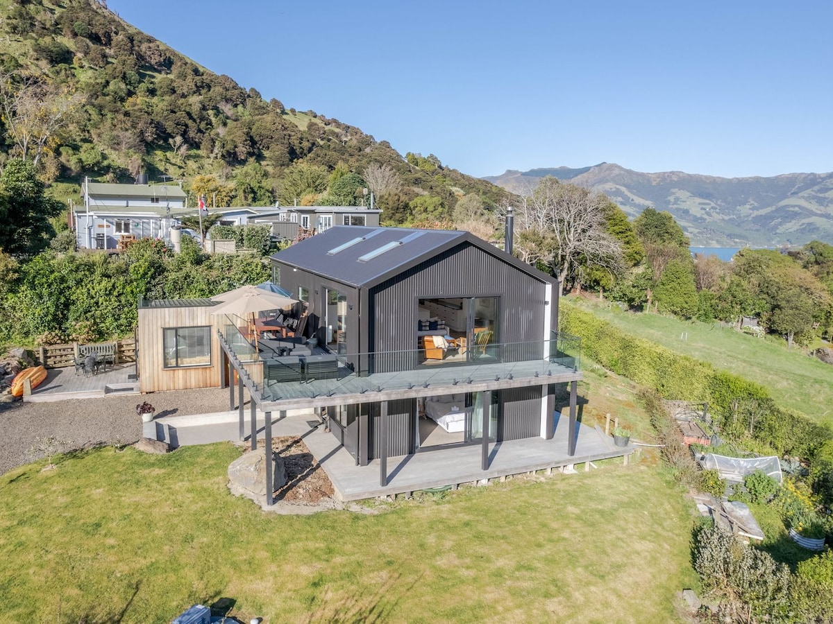 Casa de jardín moderna y elegante recientemente reformada, ubicada en el jardín junto a la casa familiar en una granja de ovejas y vacas en lo alto de las pintorescas colinas de Banks Peninsula. Ofrece amplias vistas de la granja y los animales que bajan por el valle del río Little, pasando por el lago Forsyth y hasta el océano Pacífico.