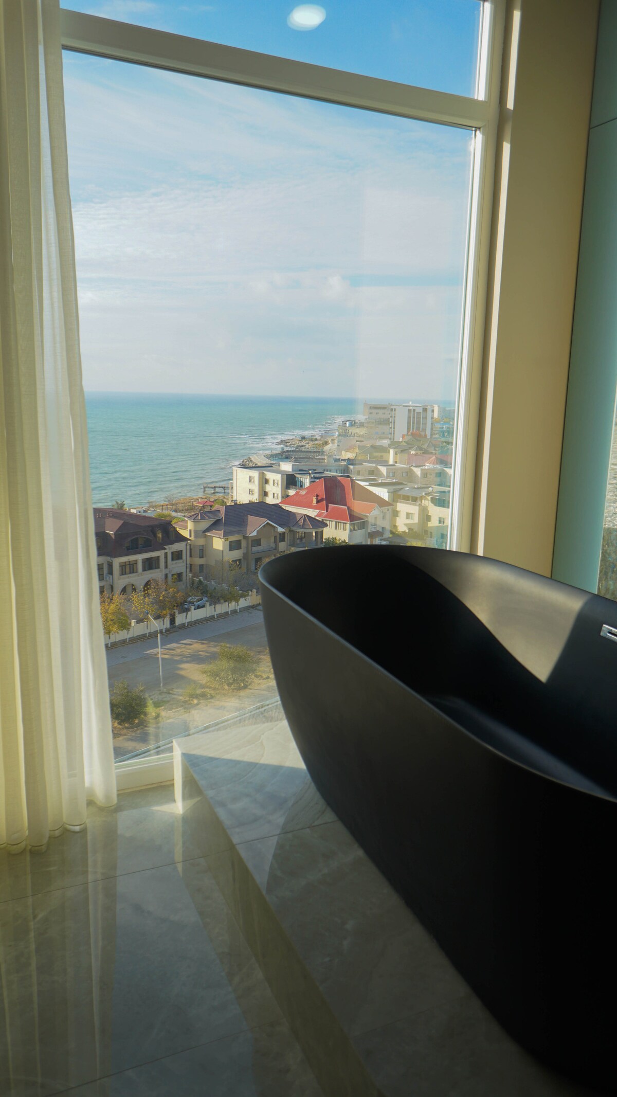 Presentamos un apartamento moderno para alquiler diario con una renovación de diseño recién terminada. El baño está hecho en un estilo minimalista con detalles en negro: una bañera independiente, inodoro y lavabo. La sala de estar y el dormitorio están decorados en colores cálidos con muebles hechos de materiales naturales, y las ventanas panorámicas ofrecen vistas al mar. La cocina está equipada con electrodomésticos modernos y un comedor acogedor. El interior se complementa con lámparas elegantes y paredes decorativas que crean comodidad y calidez.