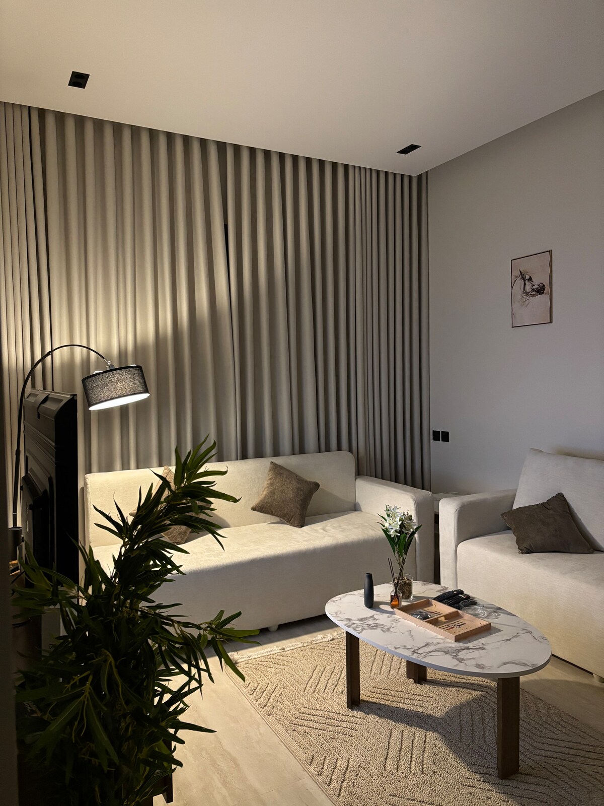 Apartamento de diseño moderno Contiene un dormitorio con una cama matrimonial con ropa de cama de hotel y un amplio salón con un televisor inteligente de 60 pulgadas con soporte para suscripción a Netflix y está equipado con nevera y también hay un bar de café y té hervidor y utensilios para el té y un baño totalmente equipado, además de internet gratuito de alta velocidad. El apartamento se caracteriza por su alta privacidad con entrada independiente También hay un ascensor eléctrico y plazas de aparcamiento privadas. Se encuentra en el barrio de Rayyan.