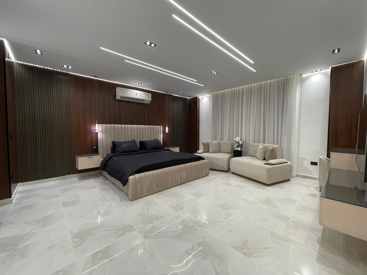 Welcome to our serene ground floor garden flat in Alburouj Compound. Featuring two comfortable bedrooms, modern bathrooms, and a large open-plan living area, our flat is perfect for relaxation. Enjoy cooking in the fully equipped open island kitchen or unwind in the private garden. With high-speed Wi-Fi, air conditioning in every room, and close proximity to local amenities, our stylish retreat offers the ideal blend of tranquility and convenience.