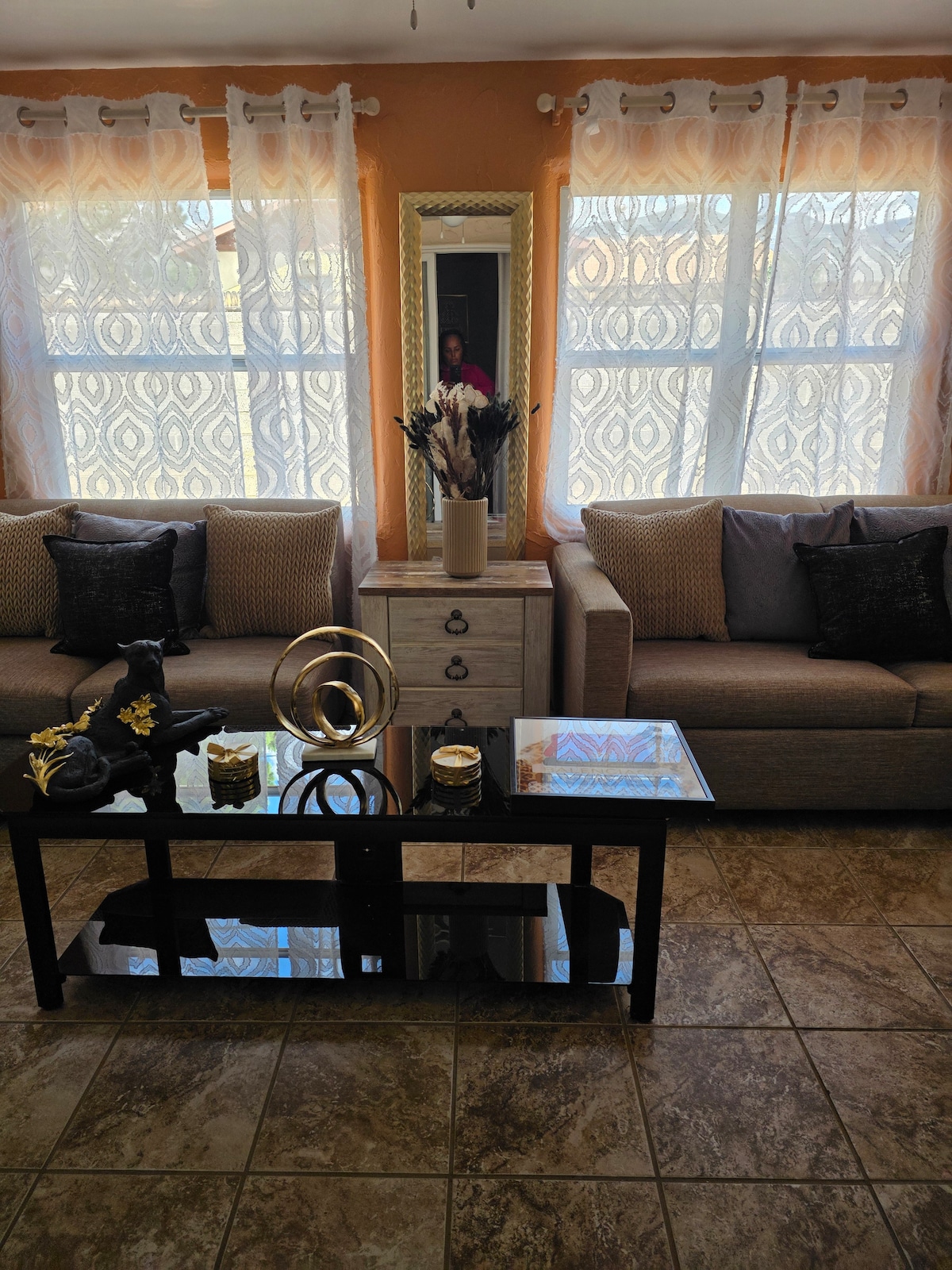 Casa céntrica de 4 dormitorios y 2 baños en un barrio tranquilo para tu grupo o familia; relájate en tu elección de 2 camas tamaño king o 2 camas tamaño queen. Reúnase en la sala de juegos con mesa de póquer, TV inteligente de 55 pulgadas, mesa de videojuegos cara a cara, guitarra eléctrica y amplificador, máquina de palomitas de maíz, nevera de bebidas, juegos de mesa y bar completo. El diseño abierto permite que todos cocinen, coman o vean una película en el televisor inteligente de 65 pulgadas juntos. Relájate en el patio cubierto con cortinas para dar sombra y asientos para todos, y una parrilla de gas.