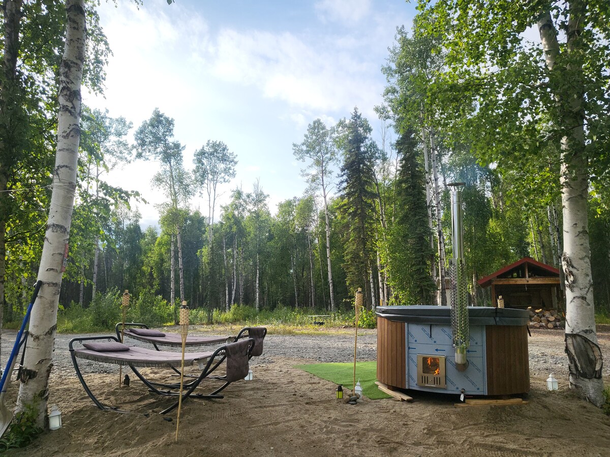 El precio por noche es de $80 (total de $10 para mascotas) Nuestro camping familiar se encuentra justo al lado de la autopista de Alaska (junto a 40 Mile Air, milla 1313) cerca del centro de la ciudad, restaurantes, un parque, cultura nativa y aventura al aire libre. Esta unidad se ha actualizado recientemente con un porche y una azotea de sombra enclavada en los pinos. Visita nuestro anillo de fuego comunitario y socializa con otros campistas. Los senderos frente al camping van por toda la ciudad.