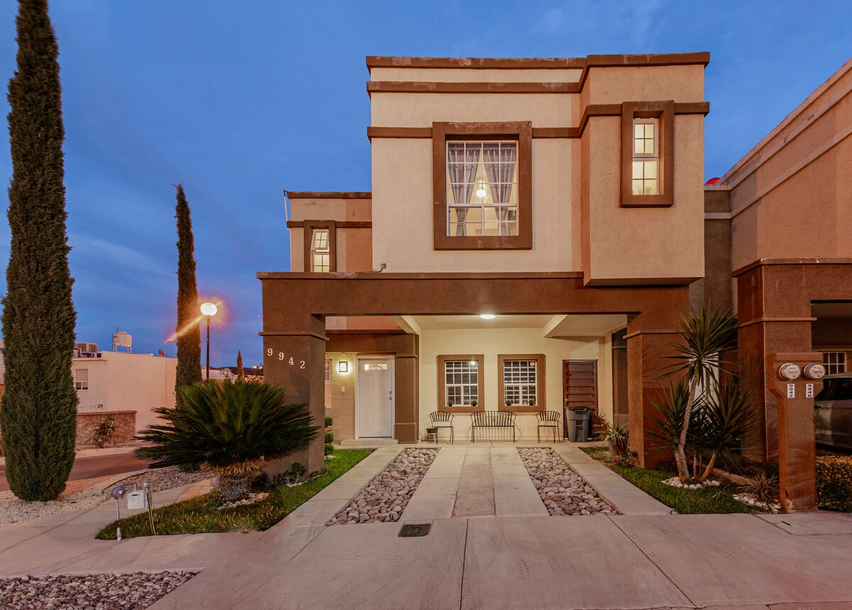 Casa con una formidable ubicación cerca del CAMPUS UACH CHIHUAHUA NORTE cómoda y completamente equipada. En FRACCIONAMIENTO PRIVADO . Cuenta con cochera eléctrica para dos vehículos. En la planta baja se encuentra una sala confortable y TV, 1/2 baño comedor de 4 sillas y una hermosa cocina equipada para una estancia placentera, bello patio con un juego de jardín y asador. En la parte alta se encuentra un baño completo y las 3 recamaras, la principal cuenta con TV, con una hermosa vista.