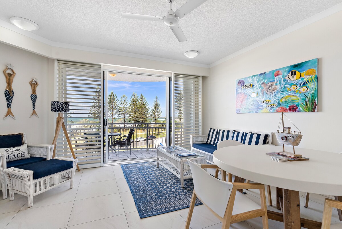 Newly renovated top floor luxury apartment with exceptional ocean views. Wi-fi and air-conditioning for your comfort with a large balcony for outdoor dining and barbecuing. A fun beach theme runs throughout the apartment. Access to the apartment is via a lift that lets you out just next to the apartment. Private on site parking is available The apartment comes with a fully equipped laundry and a new bathroom, shower and kitchen. Two queen beds. A non-smoking apartment including the balcony