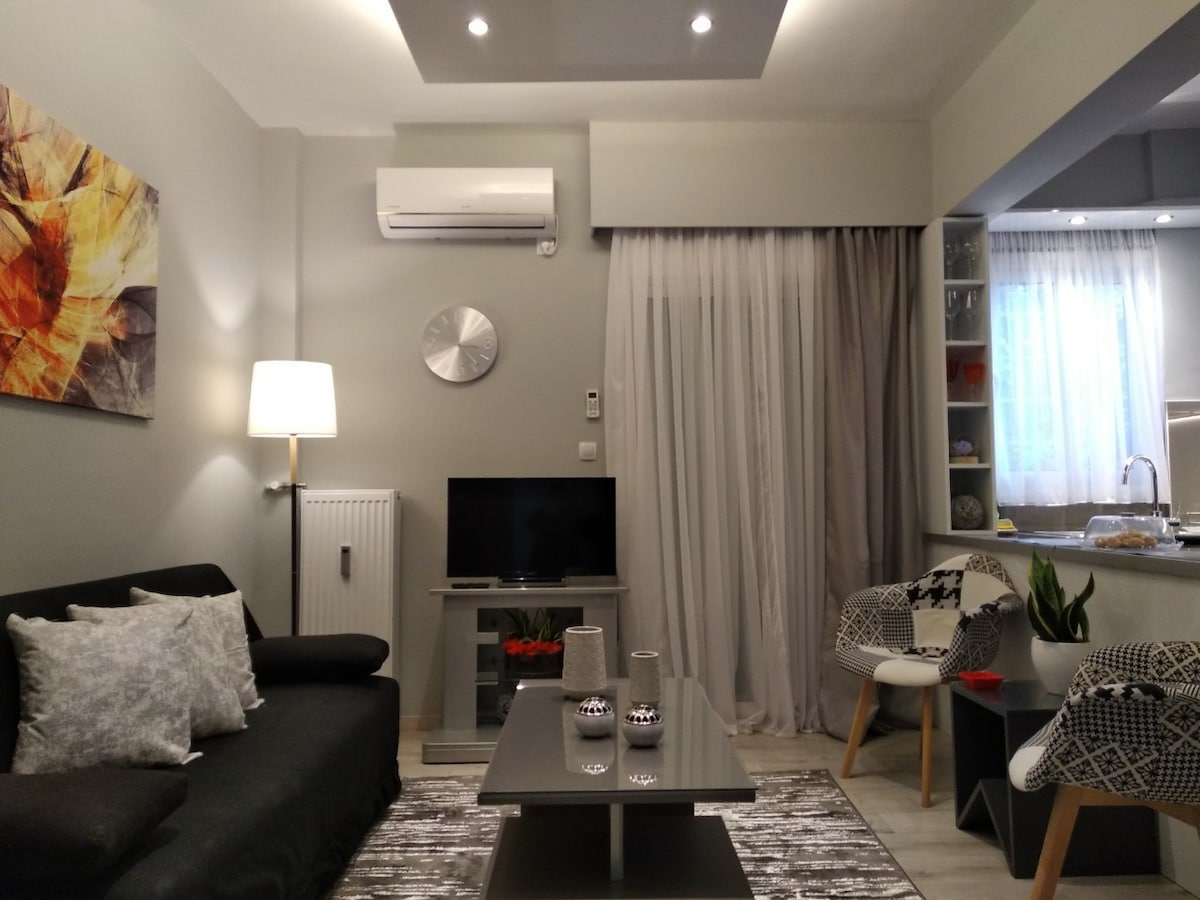 Moderno apartamento totalmente renovado, 70 metros cuadrados con 40 metros cuadrados de jardín en el corazón del sur de Atenas, a solo 2 km de la espectacular playa de la Riviera Ateniense y a 1300 metros de la estación de metro de Alimos (a 10 minutos de la Acrópolis). Esta residencia se encuentra en un barrio tranquilo, perfecto para familias y parejas. Cocina totalmente equipada, Smart TV con suscripción a Netflix, wifi de alta velocidad, baño totalmente equipado, una cama superior para dos, sofá cama para dos y cama portátil individual.