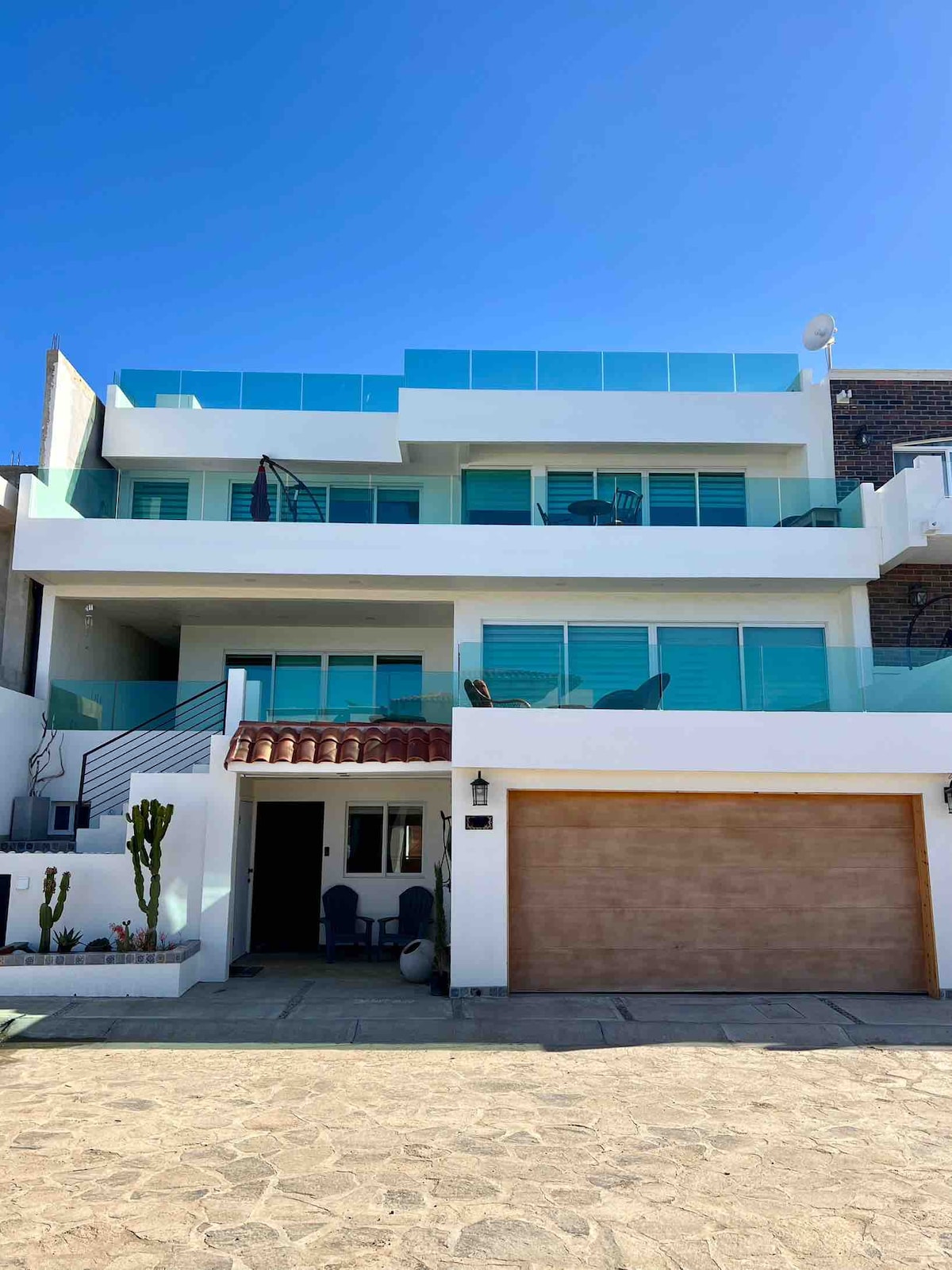Esta casa de dos plantas y 3 dormitorios ofrece un auténtico ambiente mexicano con comodidades modernas y una increíble vista de 270 grados de las montañas, el río y la playa. A media hora de las playas de Rosarito y Ensenada y a 30 minutos de la región vinícola del valle de Guadalupe.