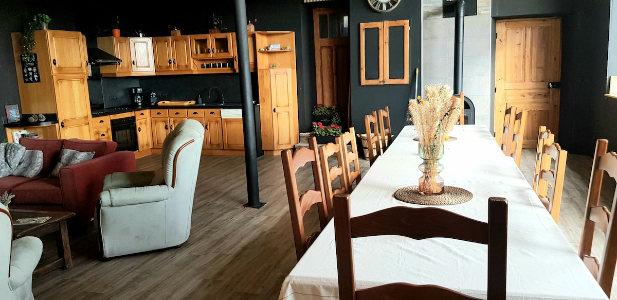 Relájese en este alojamiento tranquilo y elegante, la decoración es cuidada, los muebles de calidad, así como la ropa de cama ( algodón orgánico y gasa de algodón,lino.. ).le harán disfrutar de su estancia en este antiguo granero totalmente renovado recientemente.Lo moderno y lo rústico se combinan sutilmente en las habitaciones, el magnífico baño o la sala de estar de 40 metros cuadrados con vigas a la vista, techos altos y chimenea abierta.