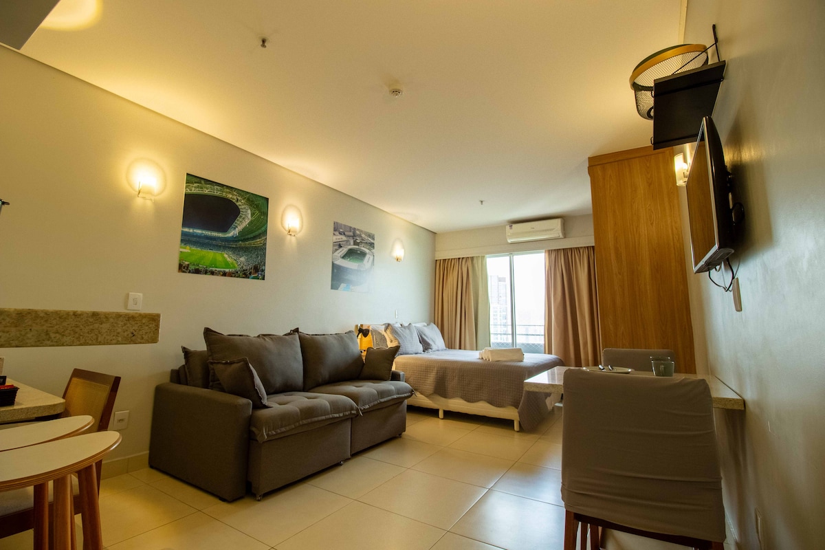 Estudio ubicado en Hotel Plaza Inn American Loft, (moderno con excelente reseña). Situado frente a Allianz Parque y Shopping Bourbon, también cerca de Unimed Space,Villa Country, bares y restaurantes . Con servicio de mensajería, plaza de estacionamiento, piscina y gimnasio en la azotea, restaurante, lavandería y dos estaciones de trabajo. El espacio: 33 m, limpio, aire acondicionado, mesa de comedor, armario grande, cama doble, sofá retráctil, televisor , persiana opaca, cocina y baño.