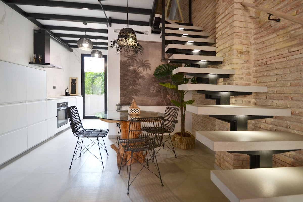 Loft situado en el corazón del barrio marítimo de Valencia, el Cabanyal, a 5 min. de la playa la Malvarosa. Casa construida en 1900 y reformada íntegramente sin perder su esencia. Este impresionante apartamento fusiona la arquitectura tradicional con un diseño boho elegante en un entorno de texturas naturales. Observe los altos techos abovedados de vigas de madera y las paredes de ladrillo expuestas mientras come en el área de cocina de mármol y se refresca en la espaciosa ducha efecto lluvia.