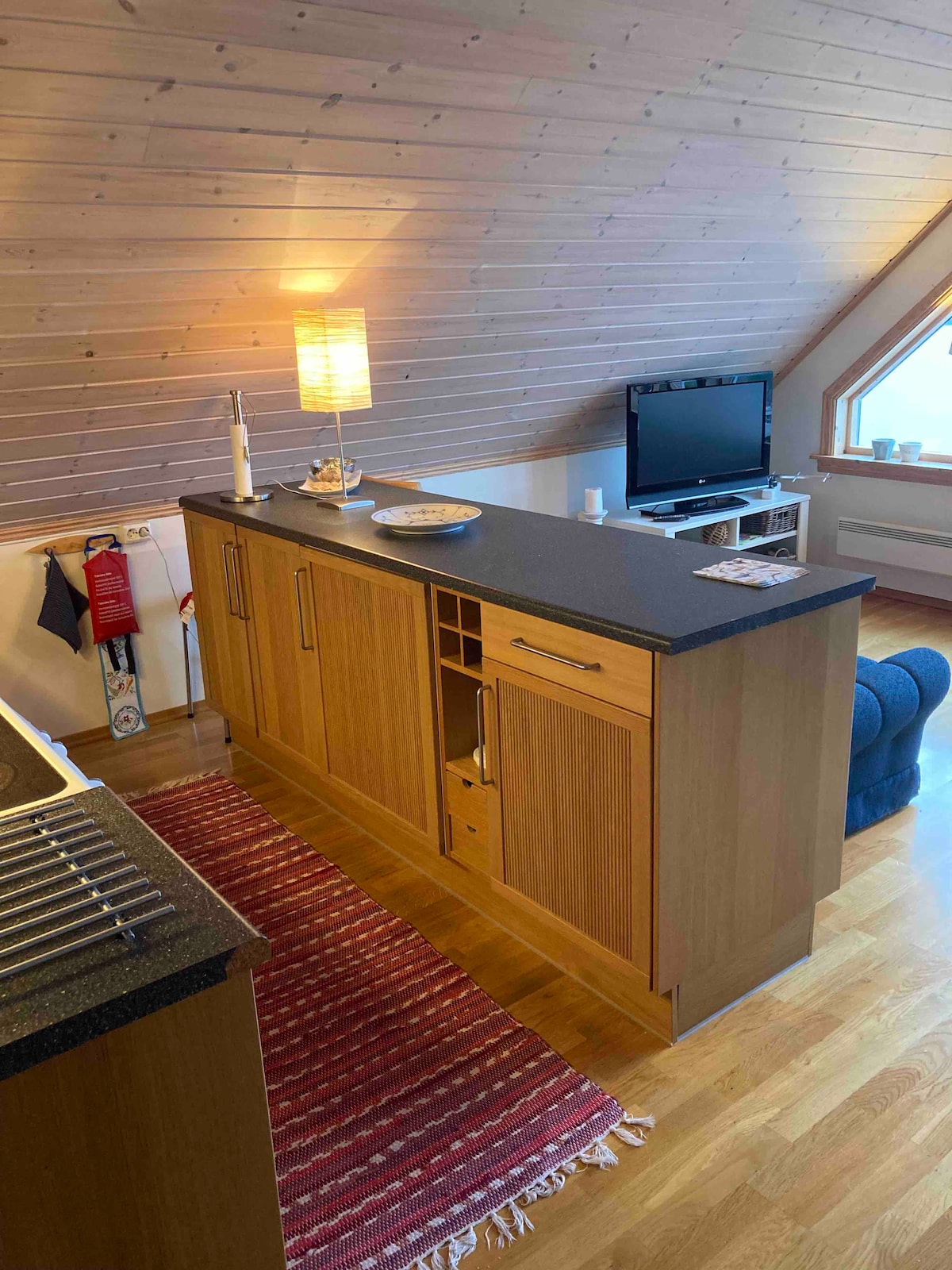 A pocos metros del centro de la ciudad, pero muy tranquilo al final de una carretera estrecha, ¡con impresionantes vistas al fiordo y a la montaña! Tu plaza de aparcamiento está delante de nuestra casa y bajas por una escalera exterior hasta tu entrada. La entrada tiene un gran armario. A continuación está la cocina moderna y totalmente equipada. El baño tiene una ducha y una lavadora secadora. Al final del pasillo hay un dormitorio con una cama de 150 x 200 cm y un armario grande, y una sala de estar con un sofá cama que se extiende hasta 140 x 200 cm y una cuna. ¡Bienvenido!