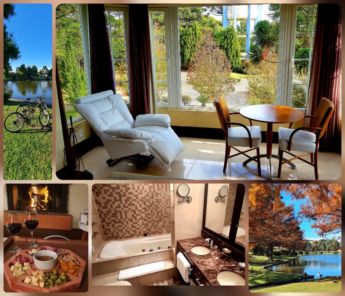 ¡ÚNICO! JACUZZI + Vista LAGO. Una mini casa, dentro del cond. Laje de Pedra, vista ÚNICA FRENTE AL LAGO, patos y otros animales libres caminando. ¡Mini Spa Jacuzzi para 3 personas temperatura de hasta 40C al aire libre y privado! Bicicletas. Lugar muy tranquilo, con mucha naturaleza, ideal para caminar y descansar. El mejor restaurante de la Serra Gaúcha está dentro del condominio. COMUNICACIÓN SIMPLE Y RÁPIDA SIEMPRE, ES GARANTÍA DE ALOJAMIENTO CON ÉXITO. ¡No es un hotel, comunícate SIEMPRE!