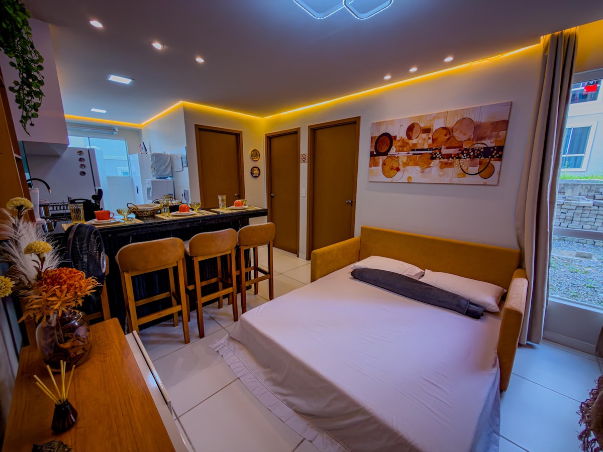 Alojamiento radiante con 1 cama doble en el dormitorio y en la sala de estar un sofá Bicama con capacidad para 4 personas. - A 500 metros del centro comercial Caruaru 🛍️ - A 400 metros de Point do caldinho. 😏 - A 300 metros de la panadería. 🥯 - A 5 metros en auto del patio de eventos de Caruaru. - A 8 m en coche de la Feria de Artesanía de Caruaru. 👒