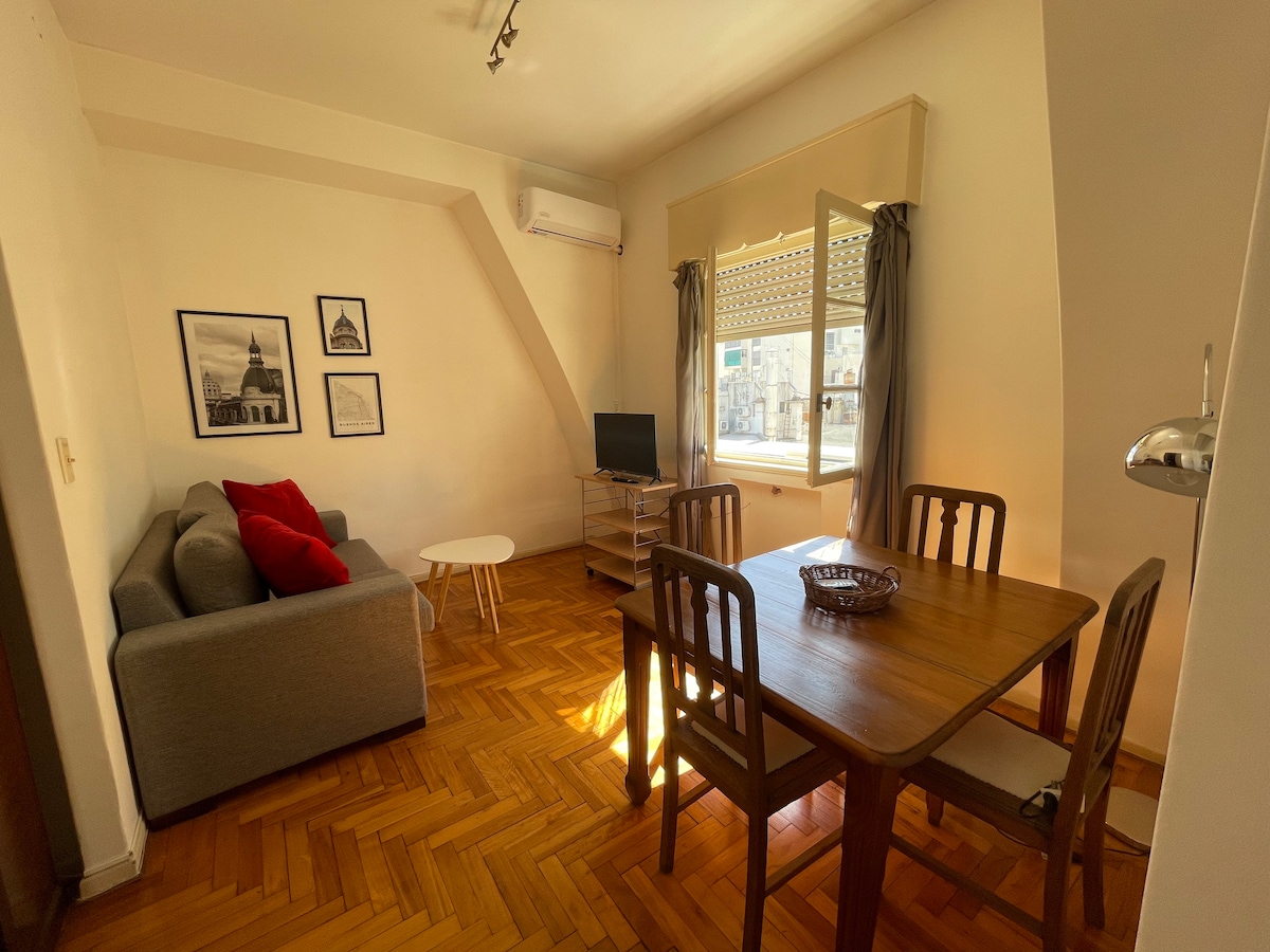 Loft luminoso y muy funcional para 2 o 3 personas en la mejor zona de Palermo y a 2 cuadras del subte. Amplio balcón, lavarropas y secarropas, aire acondicionado y todo completamente equipado para asegurar que tengas la mejor experiencia. Very luminous and functional Loft for 2 to 3 people at the heart of Palermo and 2 blocks away from the subway. Large balcony, washing and drying machines, AC, fully equipped for you to have the best experiencie possible.