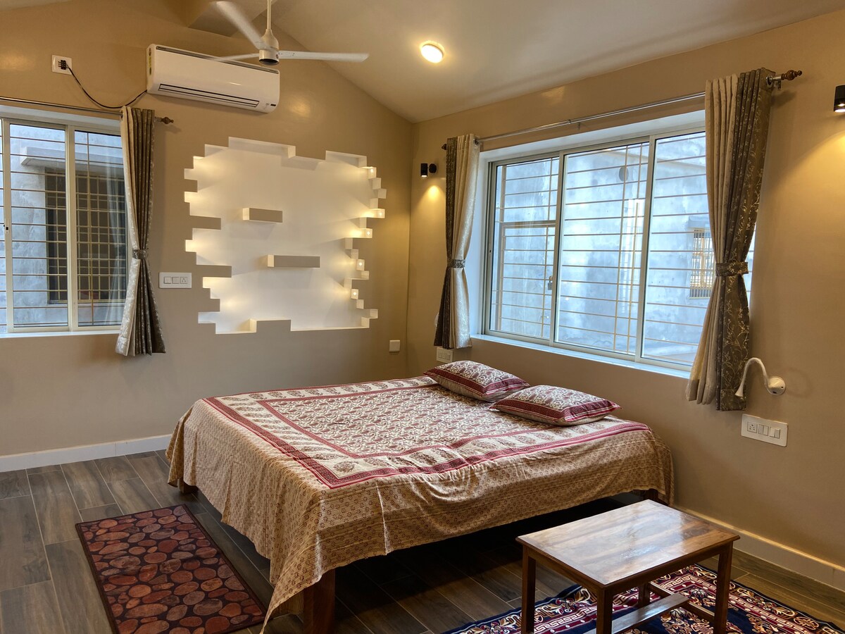 ¡Una casa de familia prémium con todos los servicios! No se permiten parejas solteras. Aire acondicionado de 1,5 toneladas, TV de 55 pulgadas con Netflix, Prime, etc. Wifi de 100 Mbps. Una mininevera. Un baño adjunto con geiser. Una cocina con utensilios. Una terraza abierta para el sol. Además de una familia bengalí hospitalaria con la que mezclarte. La ubicación es CDA, Cuttack, la mejor ubicación de la ciudad y tiene todas las tiendas posibles a poca distancia a pie. Está en el segundo piso, sin embargo, los escalones/contrahuellas son de solo 4,5 pulgadas y es apto para personas mayores.