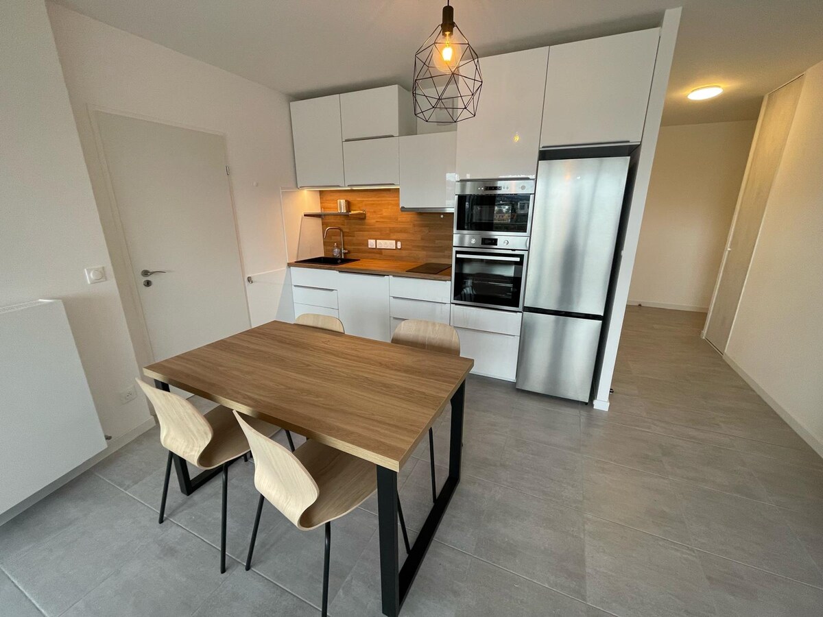 Apartamento nuevo, estacionamiento. Cerca de Ginebra y la estación de tren