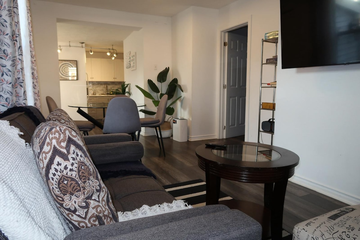 Apartamento de nueva construcción perfecto para parejas o familias pequeñas justo al lado de la QEW. Electrodomésticos nuevos. Capacidad para 4 personas: cama tamaño queen y sofá cama tamaño queen con almohadas y mantas adicionales. Televisor inteligente donde puedes acceder a Netflix, Amazon Prime, Disney y canales en vivo. Ubicado a 5 minutos en coche de las cataratas, el casino y las atracciones, así como de Niagara on the Lake y de las excursiones a las bodegas. Tiendas de comestibles, tiendas y restaurantes a menos de 5 minutos en coche.