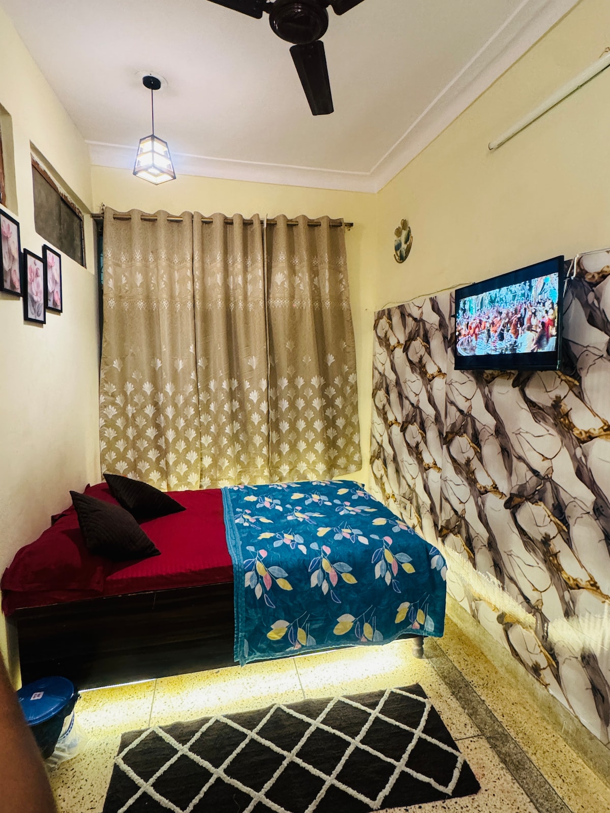 Serenidad en la azotea: una estadía tranquila en el cuarto piso, con sala de cine, proyector HD y sistema de altavoces. Ve tus programas favoritos en Netflix, Prime y Hotstar para disfrutar de una experiencia de entretenimiento sin complicaciones. Cuenta con una minisala de juegos para que las parejas jueguen, lean y pasen tiempo de calidad juntas. Relájate y descansa en un dormitorio principal bellamente diseñado, una estética combinación de pósteres y un espejo llamativo. ⚠️Horario de silencio: de 11:00 p. m. a 7:00 a. m. ⚠️ El alojamiento no tiene ascensor ⚠️ Multa de ₹500 si se deja la electricidad encendida