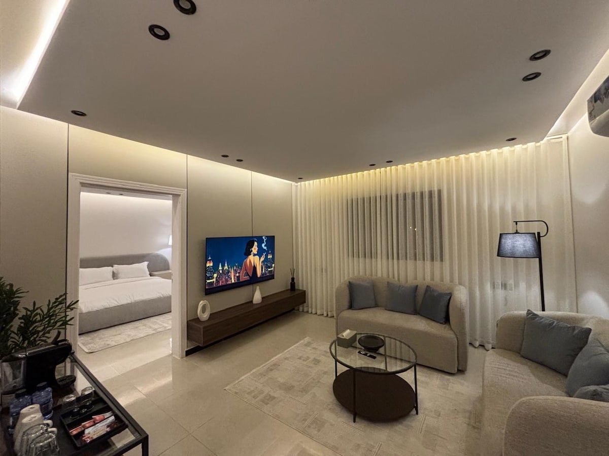 Nueva suite de hotel de lujo en Al Taawun, tranquila y con ubicación privilegiada. • Auto check-in • Bañera “banio” • Zona de estar extra • Wi-Fi • Colchón médico • Sofá premium cómodo • Parking en superficie • Amenidades de hotel • Cocina equipada • Ubicación: Norte céntrico de Riad, a 1 km del Anillo Norte; 12 min al aeropuerto; 15 min al Distrito Financiero y Riyadh Season/Boulevard; 10–15 min a Univ. Imam, Princess Nourah y SEU. • Nota: Limpieza diaria estilo hotel.