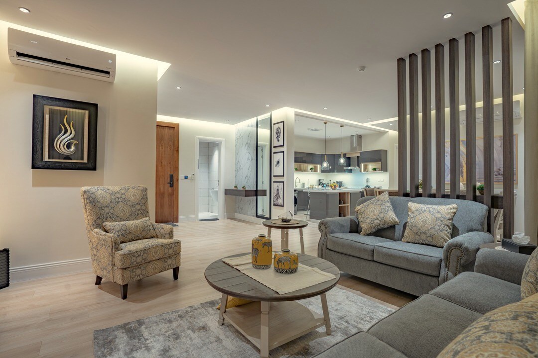 Un apartamento moderno diseñado para una estancia excepcional, situado en uno de los mejores barrios de Riad con unas vistas impresionantes de KAFD. Cuenta con una zona de estar al aire libre con pantalla y proyector para disfrutar de las noches. Para tu comodidad, la cama incluye una capa adicional de 14 cm de alta calidad. «También ofrecemos servicios de coordinación de eventos para ocasiones especiales (incluyendo pasteles y accesorios) por una tarifa adicional con reserva previa, lo que garantiza una experiencia inolvidable»