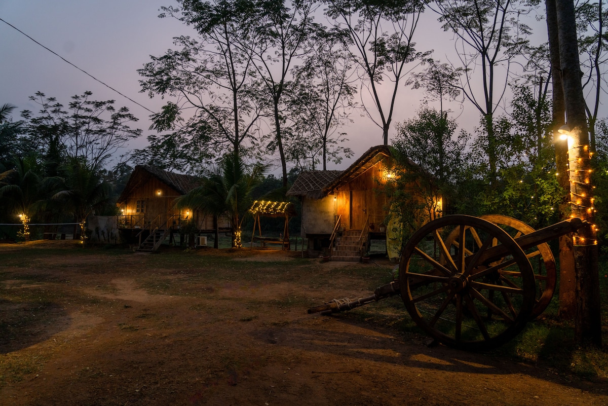 Sri Tulasi Eco Farm Stay is a beautiful organic farm around 2acres, and this wooden house with fresh water private pool with perfect river views makes your stay super memorable. Super comfortable luxury king bed, huge balcony and all these in lap of nature. One side you have river view, other side has lawn view. When it comes to activities play badminton with barefoot, take a dip in our freshwater swimming pool or simply bath in river Saradha, net cricket, fishing and gardening.