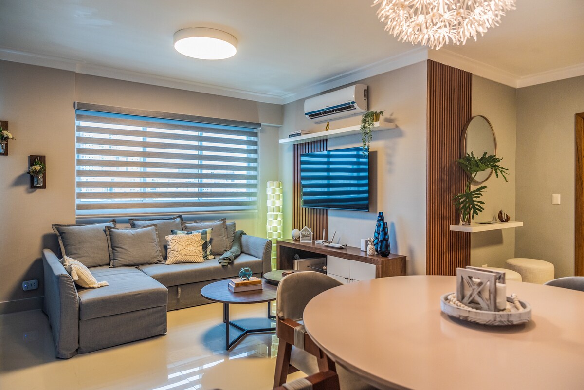 Hermoso y espacioso apartamento de 2 habitaciones completamente equipado para brindarle la mejor experiencia en Juan Dolio, cuenta con una sala acogedora con mueble amplio espectacular y televisión de 75" con equipo de sonido para disfrutar como una sala de cine de tus películas y series favoritas. También cuenta con colchones de alta gama versión americana que te garantizaran un buen descanso. Se encuentra de la playa a 2 minutos caminando. Tenemos una variedad de 8 juegos de mesas.