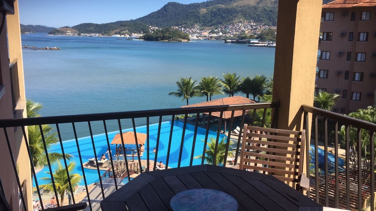 Apartamento de alta gama totalmente renovado en mayo de 2025, ubicado en el Hotel Nacional Inn en Angra dos Reis, excelente ubicación, a menos de 5 minutos a pie del principal centro comercial de la ciudad. Sala de estar con sofá cama doble, cocina americana con encimera, microondas y nevera, balcón con vistas al mar y dormitorio con cama de matrimonio, armario y TV. Zona exterior con piscina infinita con vistas al mar, bar, piscina climatizada, sauna, parque infantil, sala de juegos y canchas multideportivas.
