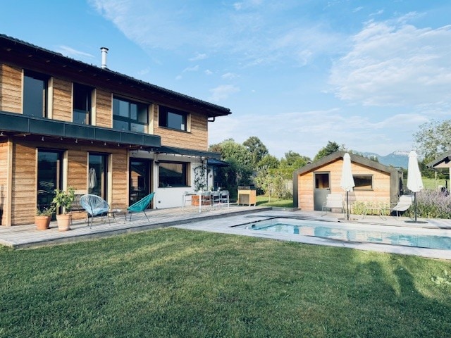 Se sentirá como en casa de inmediato en esta hermosa villa de estructura de madera situada entre el lago y la montaña. La tranquilidad y las vistas abiertas serán muy apreciadas con motivo de una suave noche en la gran terraza que rodea una hermosa piscina de 12 metros de largo. Las 4 habitaciones, todas equipadas con cama de matrimonio, le permitirán encontrarse en esta villa hasta 8 personas sin estar agobiado. El lago se encuentra a menos de 10 minutos y las estaciones de montaña a 20 minutos