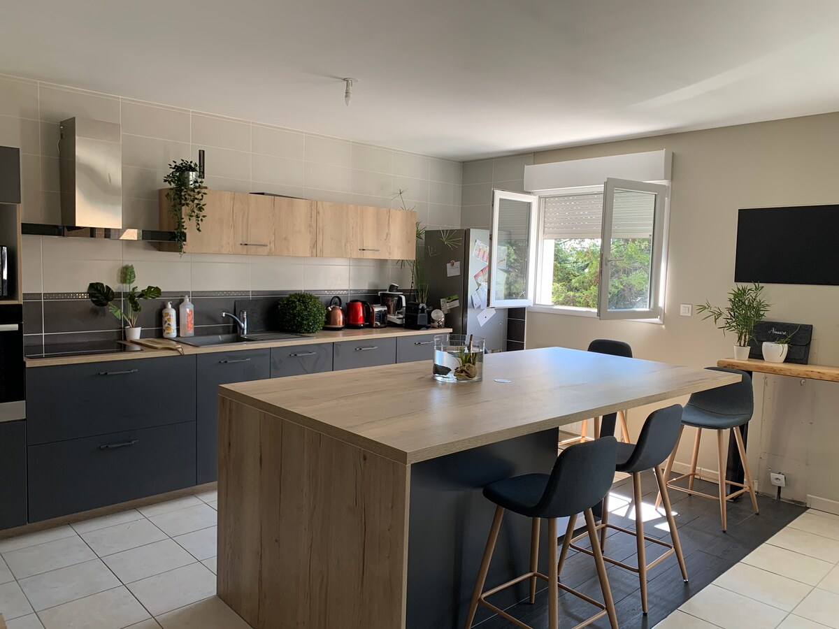 Relájese en pareja o solo en este alojamiento tranquilo y elegante de 68 m2 a dos pasos del centro de la ciudad cerca de todos los servicios Muy bonito apartamento, en el cuarto piso sin ascensor Vista excepcional, sol todo el día -Cocina totalmente equipada nueva -1 sala de estar sofá de 3 plazas -1 cama de 140 con ropa de cama + vestidor -1 cuarto de baño ducha con toallas +inodoro -1 lavadora, secadora de ropa -1 cama supletoria plegable para niños a solicitar en la reserva -TV internet+fibra - 1 MTB si es necesario