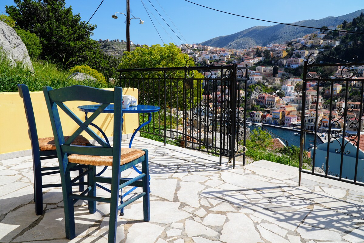 Disfruta de unas vacaciones en este departamento recientemente modernizado. Situado entre los molinos de viento en el lugar perfecto para disfrutar de las increíbles puestas de sol de Symi. Un apartamento independiente con un dormitorio, una cocina separada, baño y entrada privada. En la encrucijada del ajetreado puerto, Pedi Beach Road, a cinco minutos a pie de la aldea superior. La parada de autobús local está justo afuera. Te pedimos que nos avises cuando reserves si prefieres una cama doble grande o dos camas individuales.