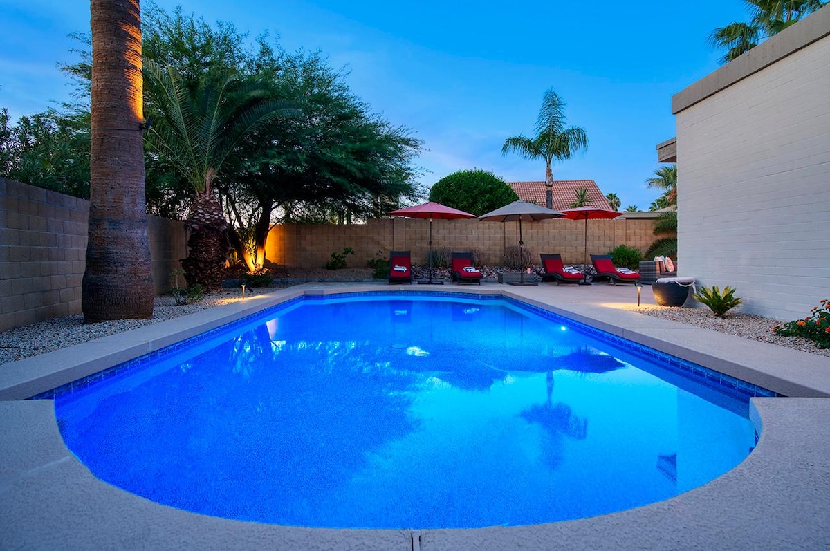 🏊 Relajación durante todo el año en la piscina climatizada de agua salada y el spa (suave para la piel/ojos) 🔥 Características acogedoras para encender el fuego 🍳 Cocina totalmente abastecida + parrilla de propano al aire libre 🎱 Sala de juegos con mesa de billar, futbolín, dardos y TV de pantalla grande 🌞 Comedor y bar al aire libre para disfrutar del clima de AZ 📺 TV al aire libre para juegos/películas mientras te sumerges en el spa 🚗 Fácil acceso a 2 autopistas principales 🎨 Decorado de forma artística y única Escapada tipo resort en Phoenix (Glendale mailing), perfecta para familias, viajes de golf y vacaciones