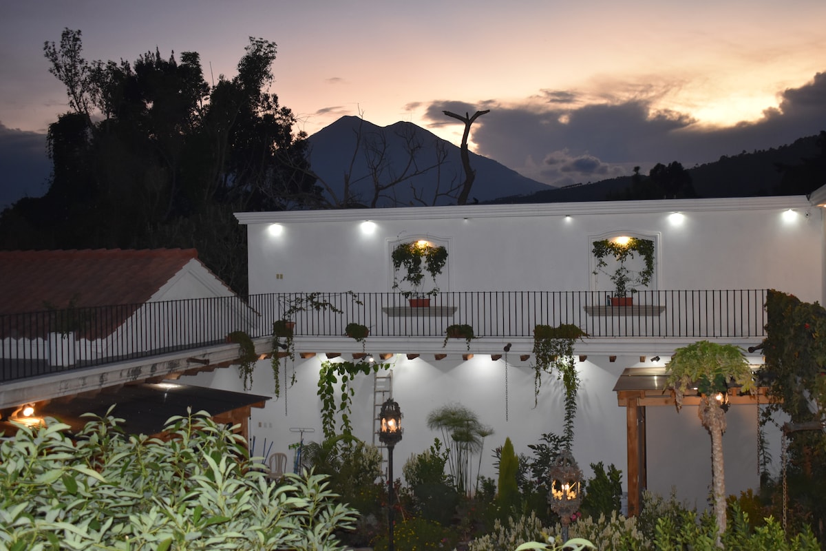 Al ingresar a nuestra casa a través el muro de piedra sobre la calle de adoquines hacia nuestro jardín delantero, estarás envuelto en la Antigua Colonial. Este pequeño enclave de viviendas es tranquilo. Todas las habitaciones están decoradas con antigüedades y objetos de la época colonial. Se pueden ver amplios jardines desde todas las habitaciones. Los jardines constan de fuentes, búcaros, piscina, jacuzzi, parrilla de gas y cancha de basket. Vista de 3 volcanes, Agua, Fuego, y Acatenango.