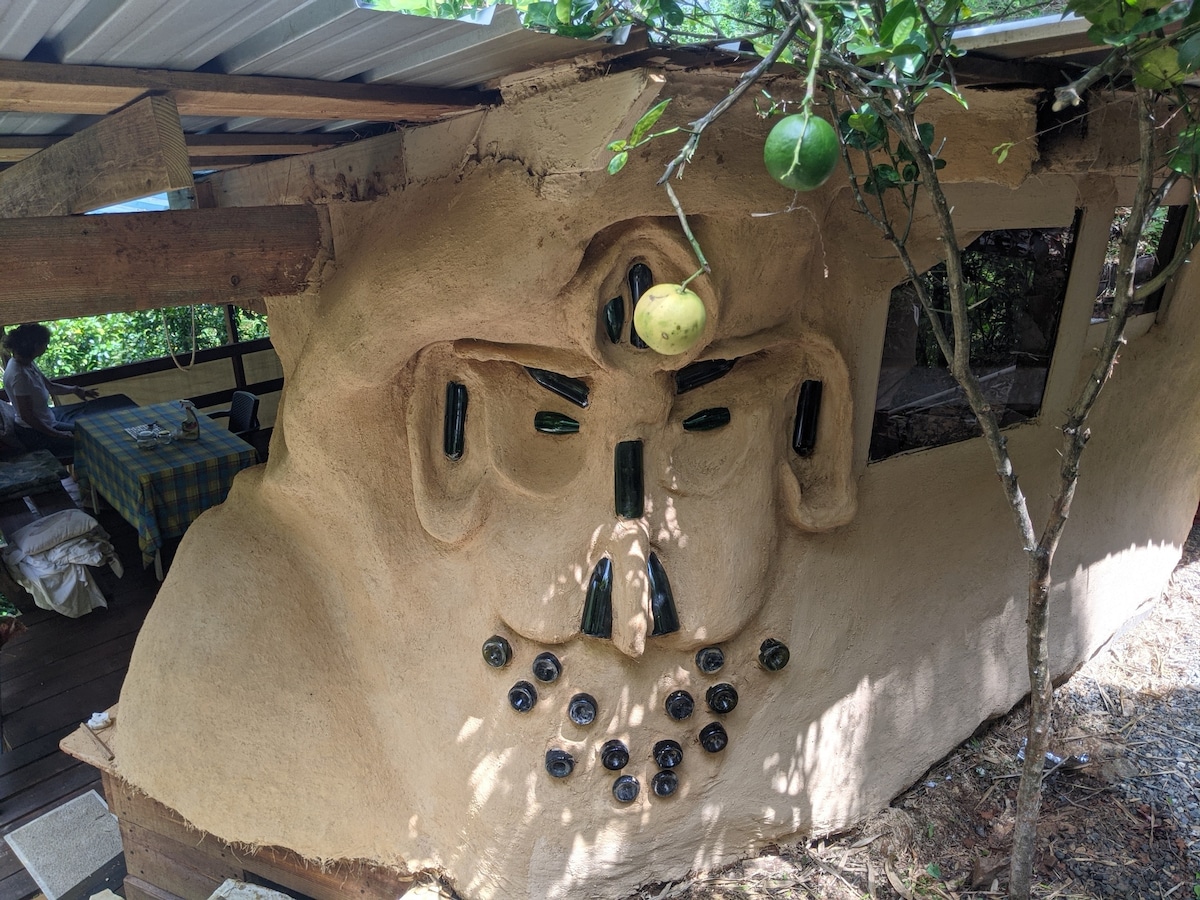 ¡Ven a experimentar la vida en una auténtica casa redonda de adobe! Esta es una oportunidad increíblemente especial para alojarte en una casa única, esculpida a mano con arcilla de nuestra tierra. La casita tiene un baño privado al aire libre contiguo con inodoro de compostaje y ducha caliente. Estamos fuera de la red, toda nuestra agua proviene de nuestro manantial y tenemos energía solar. La casita está junto a una cocina al aire libre grande y bien equipada, y rodeada de exuberante naturaleza. Haz una excursión a nuestro arroyo o a un río increíble con grandes cascadas y piscinas.