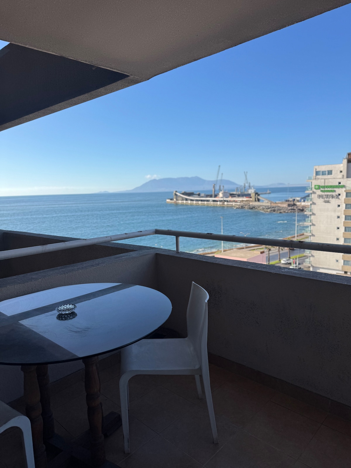 Dpto. Céntrico con vista al mar y Estacionamiento privado bajo techo. full amoblado, excelente ubicación A 10 min del centro. A 2 cuadras a pies de super lider express. A 5 min de la Municipalidad. A 3 min del Hospital Regional. A 3 min del terminal de buses. A 30 min del aeropuerto. Wifi y televisor smart tv de 43”, con Netflix, HBO premium. Cocina full equipada; Hervidor, horno eléctrico, microondas y lavadora secadora sillón reclinable. Silla reposera con vista al mar Conserjería 24 hr