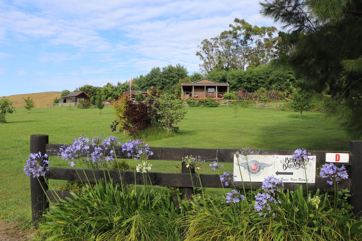 🏡 Retiro pacífico suizo-neozelandés Escápate a nuestra tranquila granja, rodeada de canto de pájaros y exuberante vegetación, perfecta para una escapada de fin de semana o una recarga más larga. ✨ Incluido: un desayuno continental casero (disponible para estancias de 1 a 6 días) ☕🥐 🛀 Opcional: Relájate en nuestra piscina de hidroterapia por solo $10 por persona (válido por dos días). Un lugar para relajarse, reconectarse con la naturaleza y disfrutar de la auténtica hospitalidad suiza-kiwi. 🌿