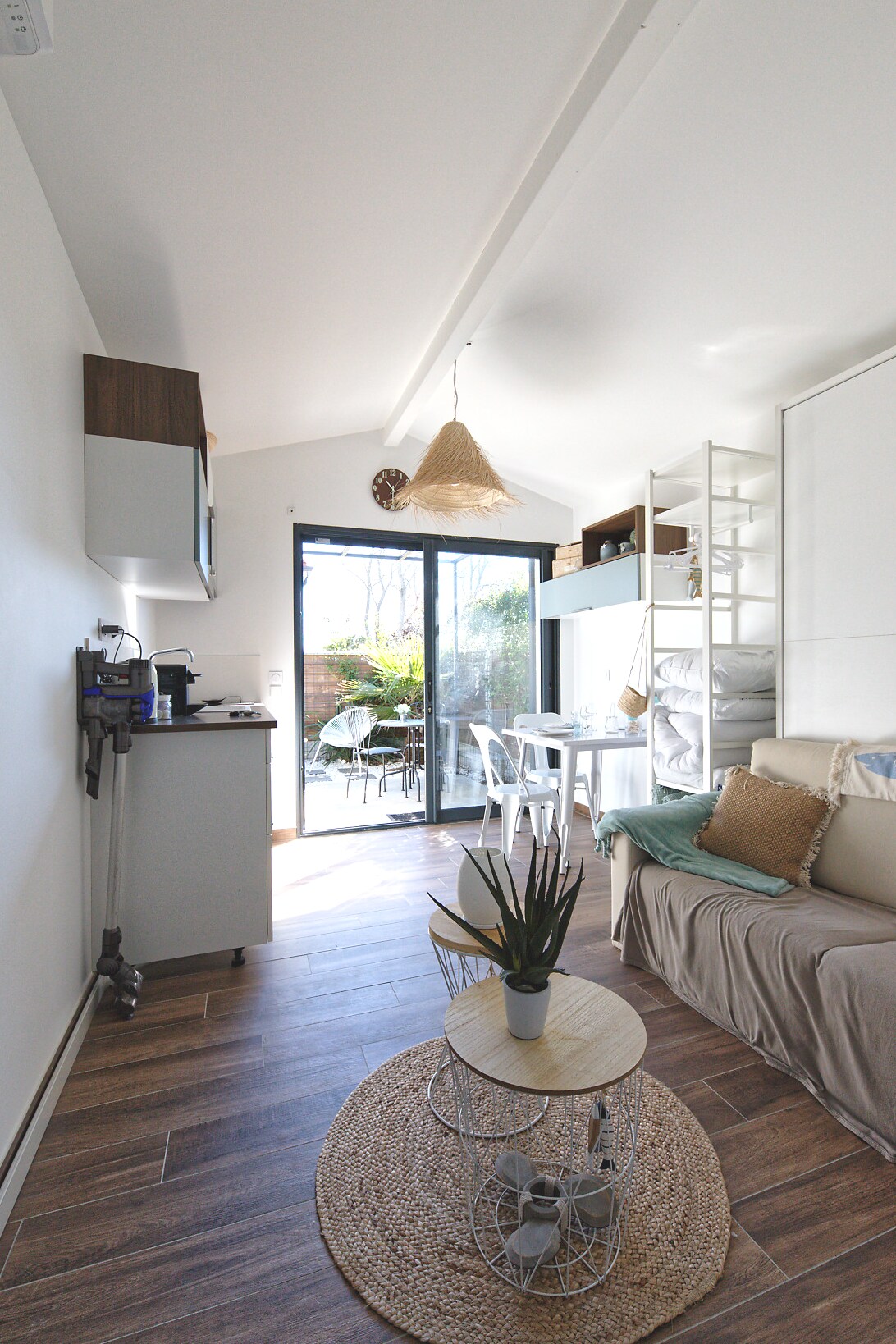 Niché sous les chênes et au calme nous vous invitons à découvrir notre charmant studio neuf de 40m2, idéalement situé entre Arcachon et le Cap Ferret. Ce studio, à la fois spacieux et confortable, est équipé d’une cuisine moderne, d’une climatisation réversible et d'un espace de travail équipé d’une connexion fibre. Une place de parking est à votre disposition avec possibilité de recharger votre véhicule électrique.