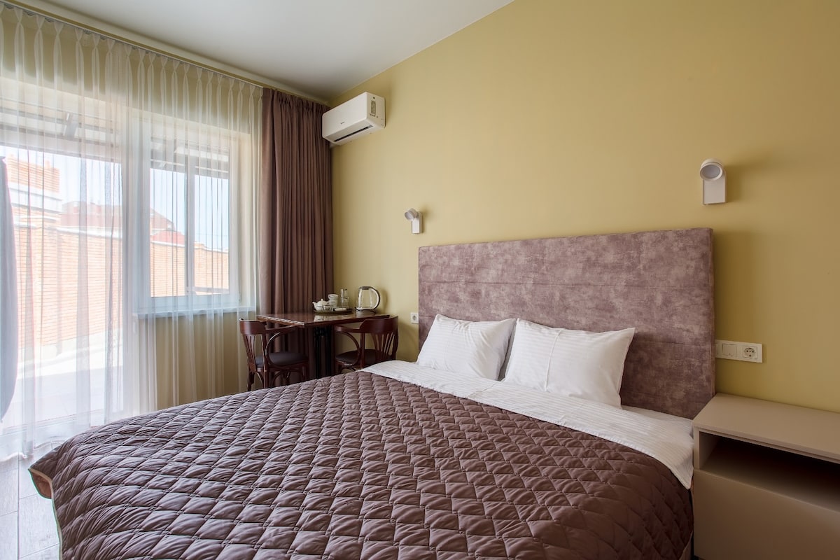 Habitación doble superior, 27 m², para 1 o 2 huéspedes. Habitación acogedora y tranquila con vistas al patio. La habitación tiene una cama doble. Aire acondicionado, insonorización, baño privado, Wi-Fi rápido, TV, minibar, hervidor de agua y cafetera, escritorio. Incluye estacionamiento gratuito e internet de alta velocidad. Ideal para vacaciones y viajes de negocios.